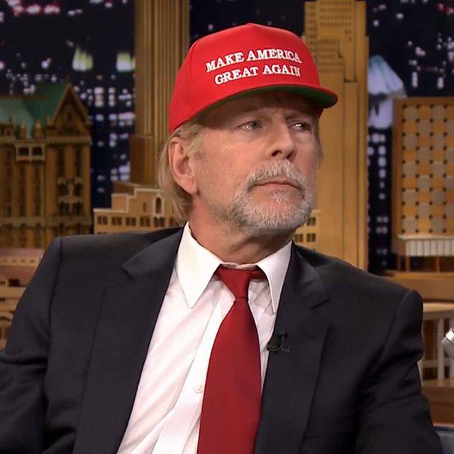 Bruce Willis didn’t rock his usually cue-ball look at the Tonight Show with Jimmy Fallon on Friday night. Instead, the megastar sported a wig and a Donald Trump hat to the mirror the billionaire and GOP front runner.