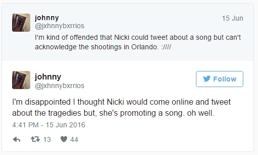 Would I have handled critics exactly like Nicki Minaj did? No, but there was a lotof presumption in one particular tweet that sparked additional online criticism. The tweet in question read: “I’m kind of offended that Nicki could tweet about a song but can’t acknowledge the shootings in Orlando.”