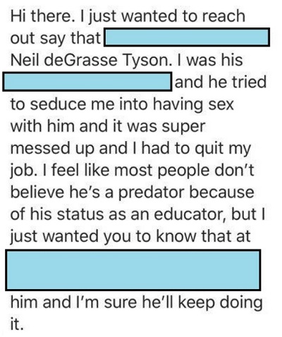 It seems that Neil deGrasse Tyson may be exhibiting the same pattern of behavior, exploiting vulnerable women to fulfill his sexual urges while threatening to use his academic standing and celebrity power to either help them succeed or destroy their careers, depending on whether they agreed to sleep with him.